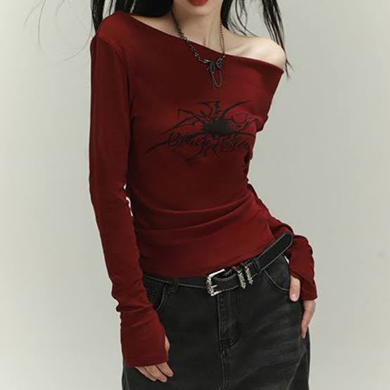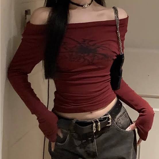 Red Off-shoulder Spider Long Sleeve Crop Top
